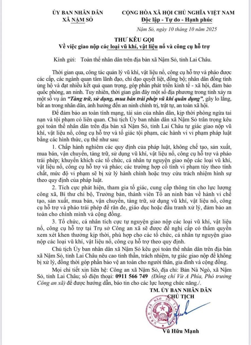 THƯ KÊU GỌI TOÀN DÂN XÃ NẬM SỎ Về việc giao nộp các loại vũ khí, vật liệu nổ và công cụ hỗ trợ