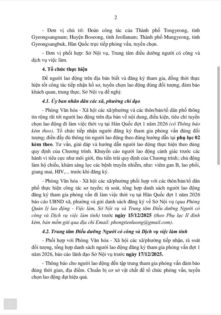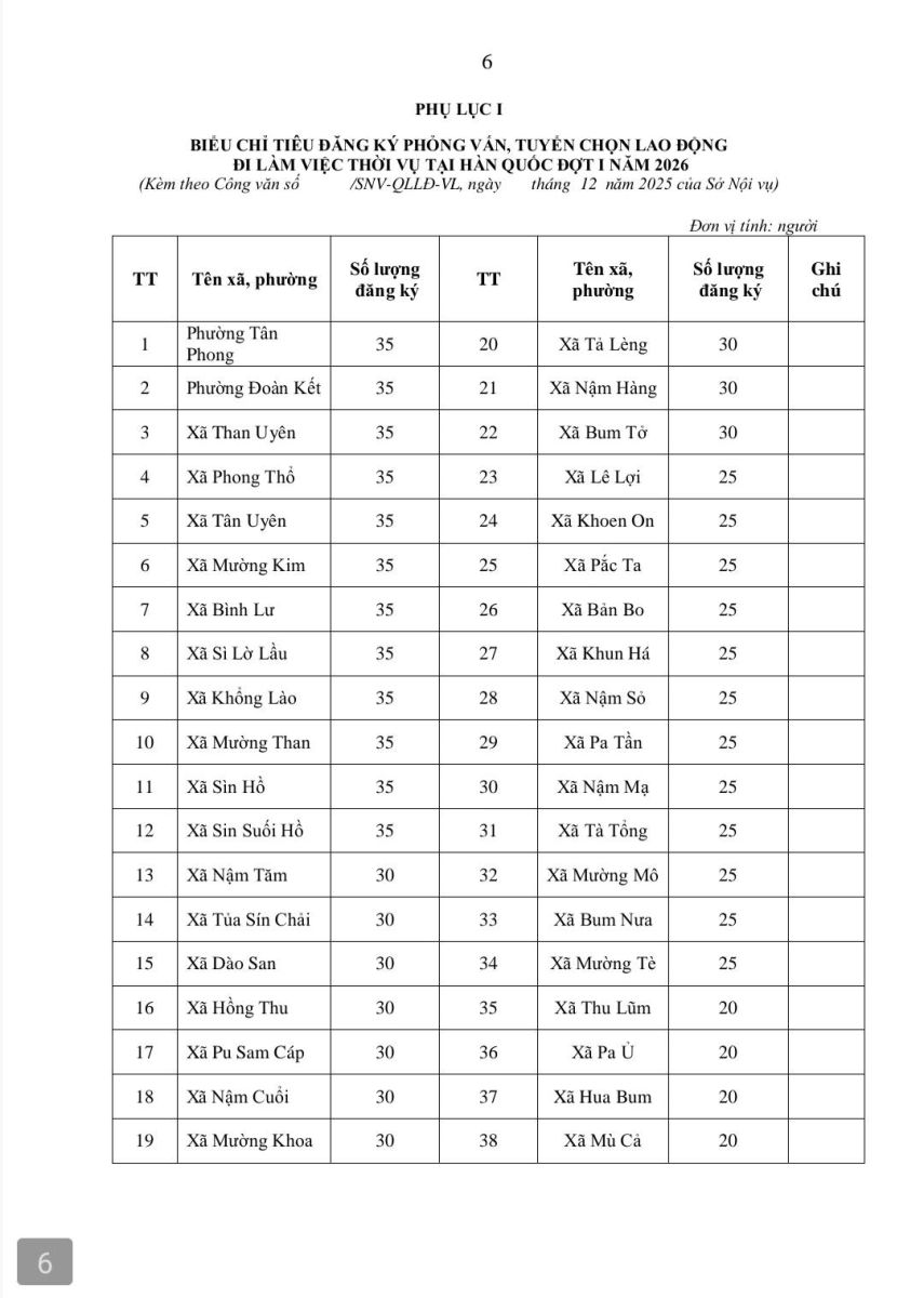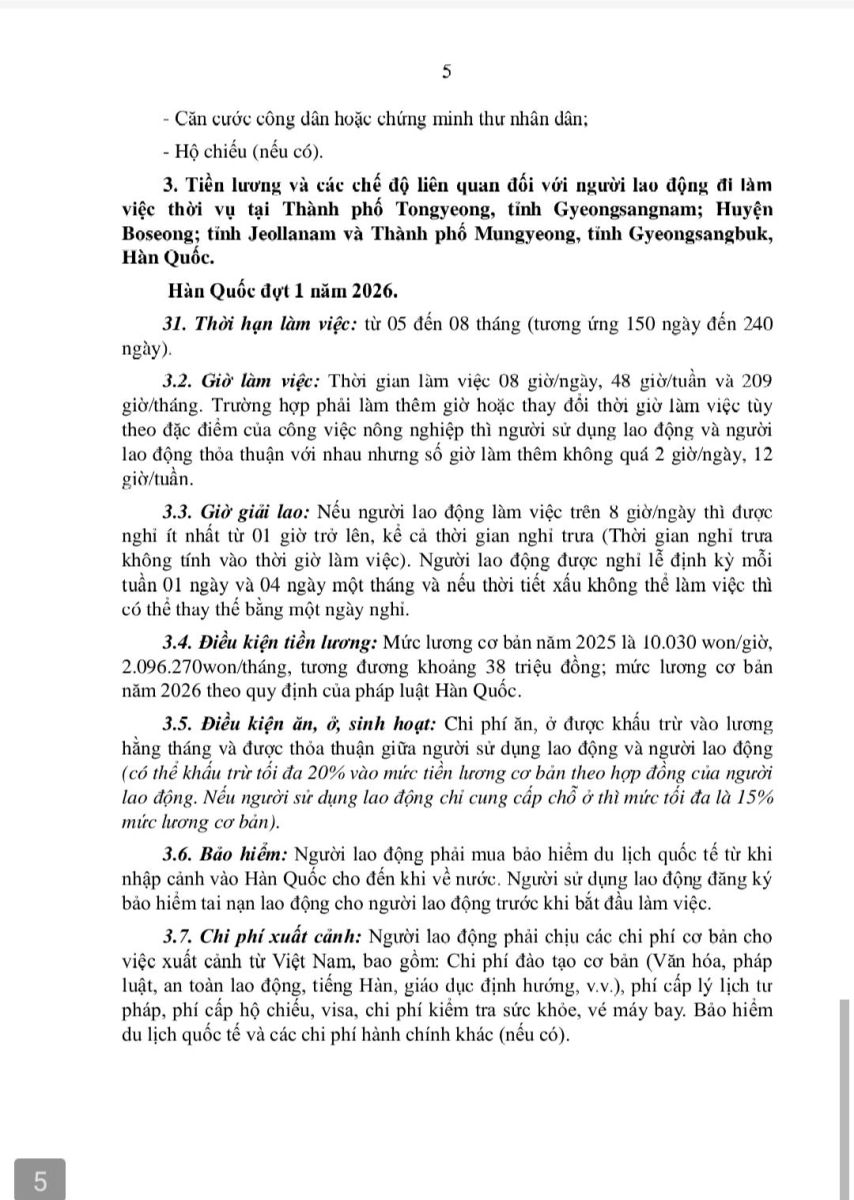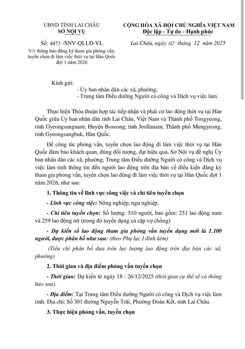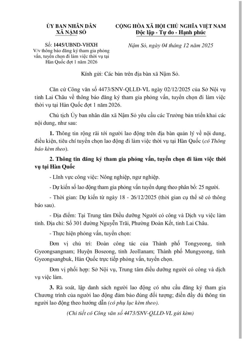 UBND xã Nậm Sỏ trân trọng thông báo tới bà con nhân dân về chương trình tuyển chọn lao động thời vụ làm việc tại Hàn Quốc năm 2026. Đây là chương trình hợp tác chính thức giữa tỉnh Lai Châu và các địa phương Hàn Quốc (Tongyeong, Boseong, Mungyeong), không qua môi giới.
