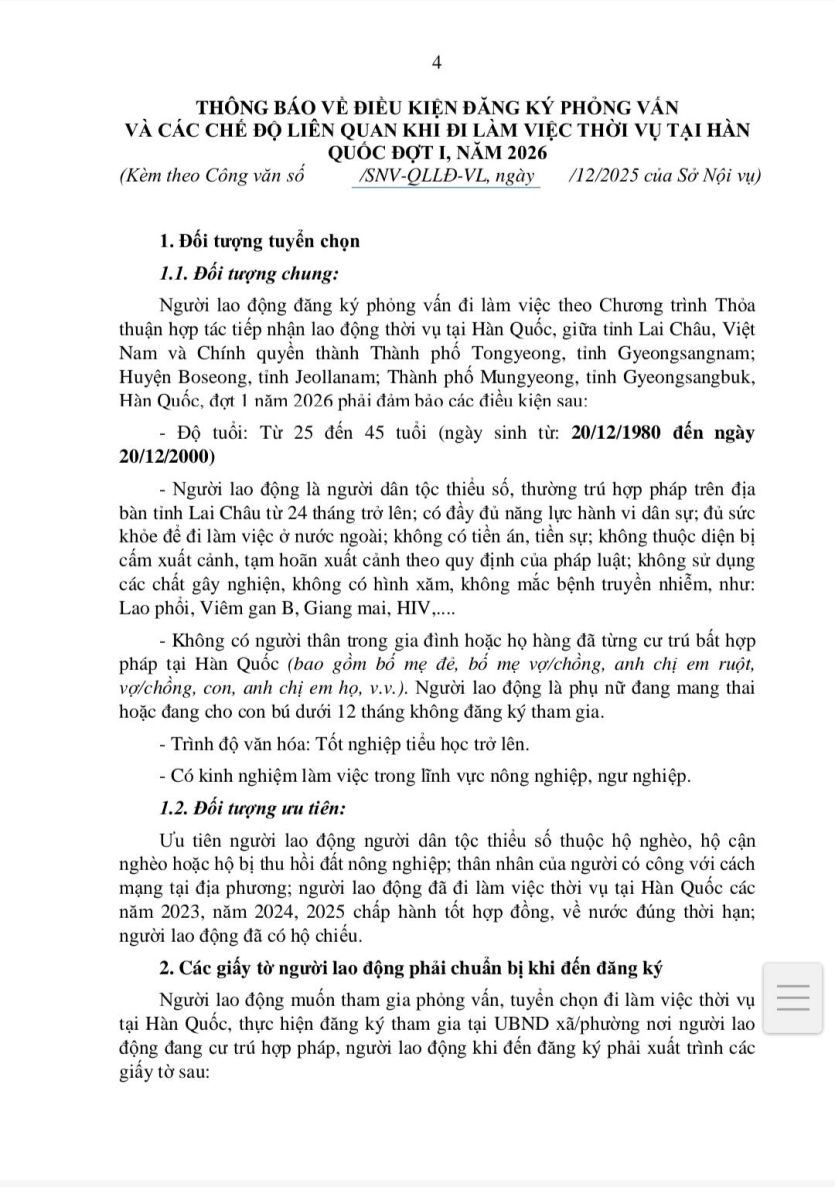 Ưu tiên: hộ nghèo, cận nghèo, hộ bị thu hồi đất, thân nhân người có công, người đã từng đi Hàn Quốc về đúng hạn, người đã có hộ chiếu.